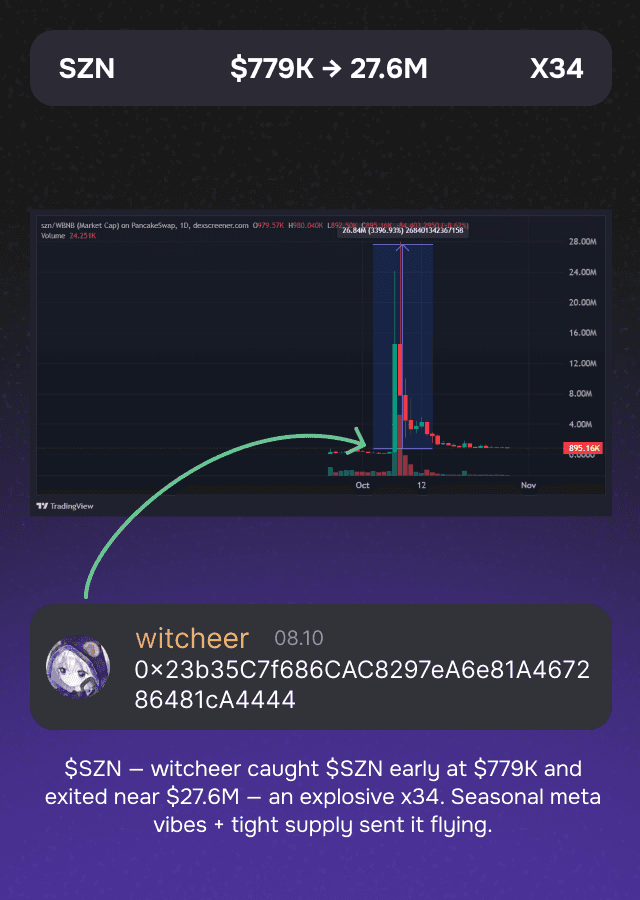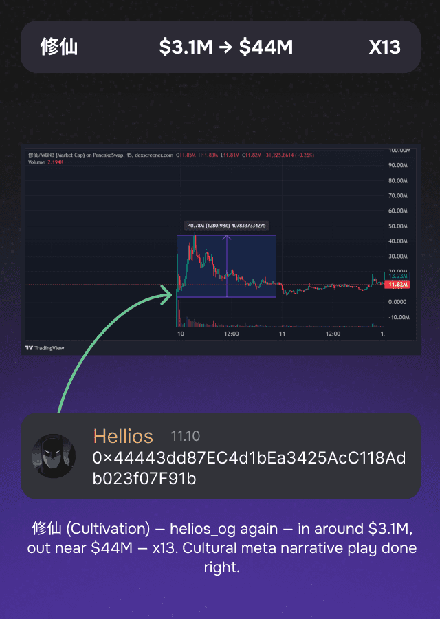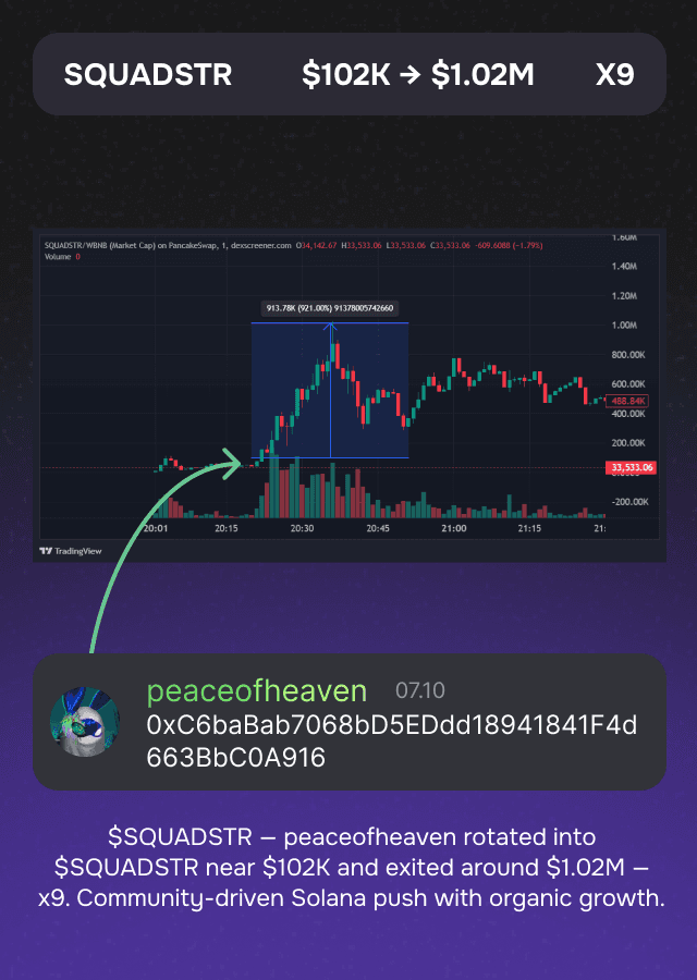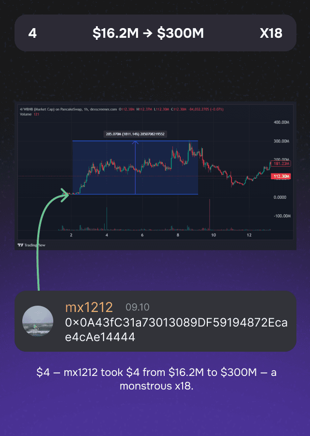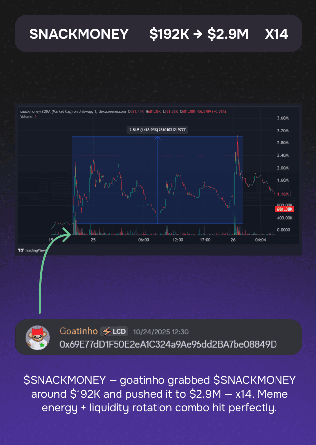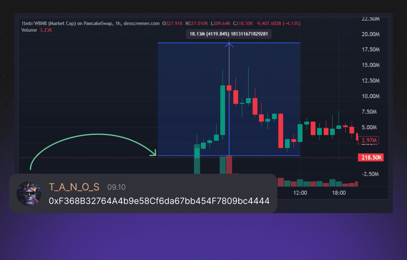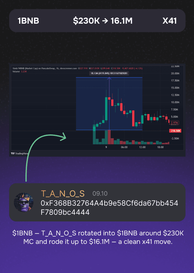 $1BNB — T_A_N_O_S rotated into $1BNB around $230K MC and rode it up to $16.1M — a clean x41 move.